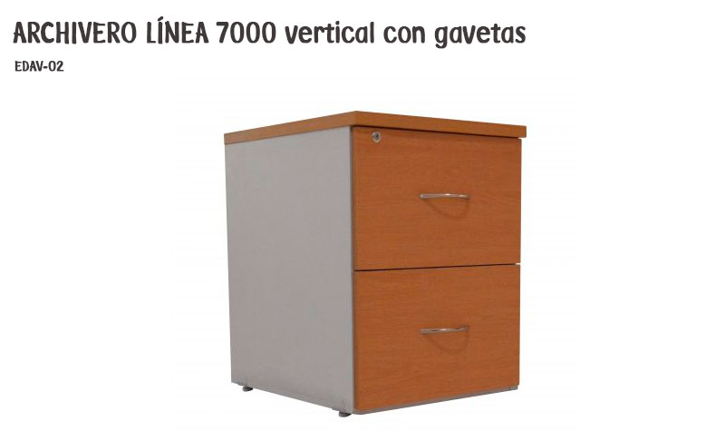 Archivero vertical 2 gavetas, fabricado en melamina de 28 y 16 mm de espesor con corredera de extensión embalinada, cantos en pvc termo adherido con niveladores.