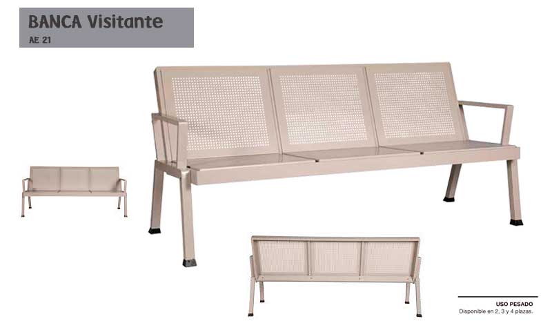 Banca TANDEM 3P o 4P, capacidad de 150 kgs. por asiento, cuerpo fabricados a base de lamina de acero rolado en frio cal. 18, con doble curvatura en los extremos, soporte horizontal fabricado en perfil rectangular de acero rolado en frio cal. 14, pata y descansa brazos fabricados en lamina de acero rolado en frio cal. 18, regatones de goma en color negro.