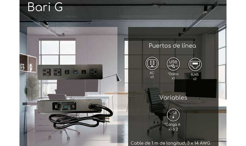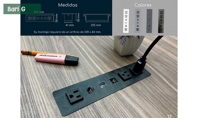 Su sistema es desarrollado para estar libre a la superficie, es decir, sin tapa para ocultar contactos y de esta manera tener la posibilidad de conectar cualquier adaptador o dispositivo sin preocuparnos por el tamaño de este. Fabricado en Acero con recubrimiento de pintura electrostática las cual nos ayuda a proteger la calidad y tiempo de vida del color.