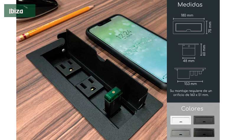Su sistema de apertura es manual mediante una puerta que nos ayuda a ocultar los contactos cuando no son utilizados. Fabricado en Acero con recubrimiento de pintura electrostática las cual nos ayuda a proteger la calidad y tiempo de vida del color.