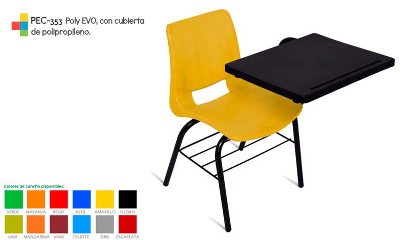 estructura de tubular redondo de 1” cal.18 reforzado, con parrilla de 1/4. Asiento y respaldo integrados en una concha de polipropileno con transferencia térmica azul, verde, amarillo, negra, verde lima, mandarina(naranja),vino, celeste, gris y rojo