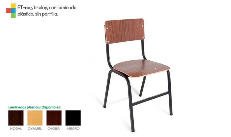 Estructura fabricada en tubular cuadrado de 3/4″ , respaldo moldeado ergonómicamente y asiento recto de triplay de 11 mm de espesor forrados con laminado plástico color negro, nogal(teka), oyamel y caoba.