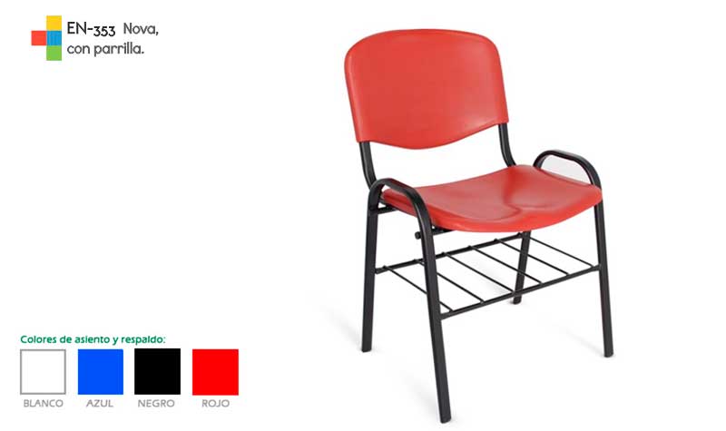 Estructura fabricada en tubular ovalado de 5/8″ x 1 1/8″ cal. 18, con parrilla, acabado en pintura horneada micropulverizada color negro semi mate texturizada. Asiento y respaldo de polipropileno moldeado ergonómicamente en color blanco, azul, rojo o negro.