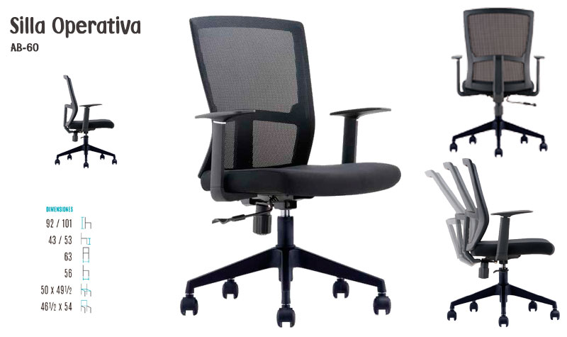 Repaldo tapizado en malla en color negro y marco en polipropileno color negro, asiento tapizado en tela color negro de linea (opcion a tela de catalogo de tapices) y hule espuma de alta densidad de 40 kgs./m³, mecasnimo ejecutivo simple sin bloqueo, brazos fijos en poliuretano color negro, piston ejecutivo, base en nylon de 26” con rodajas tipo yoyo en nylon, soporta peso de 150 kgs.