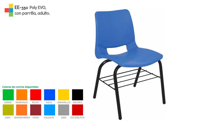Estructura fabricada en tubular redondo de 1″ y refuerzos laterales en tubular redondo de 1/2″. Asiento y respaldo conformados por una concha de polipropileno inyectado en una sola pieza con transferencia termica ; en color: azul, verde, amarillo, negra, verde lima, mandarina(naranja),vino, celeste, gris y rojo
