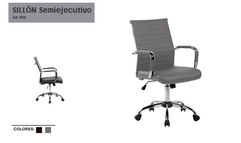 Marco en respaldo, tubular de acero planchado de 1” cal. 18, doblado en forma ergonomica, travesaños para fijar herraje en tubo planchado de 1” cal. 18 pintado, manerala en la parte posterior para mover el sillon en tubular 1” cal. 18, respaldo y asiento en tapiz tensada de vinil en color negro o gris, hule espuma en asiento de 5 cms. de espesor, brazos en tubular de acero eliptico de 1¼” cal. 18, cromados, con funda en vinil color negro o gris, pistón ejecutivo en cromo, base cromada de 26”, mecanismo ejecutivo, sistema reclinable, mecanismo de bloqueo y ajuste neumático de altura.