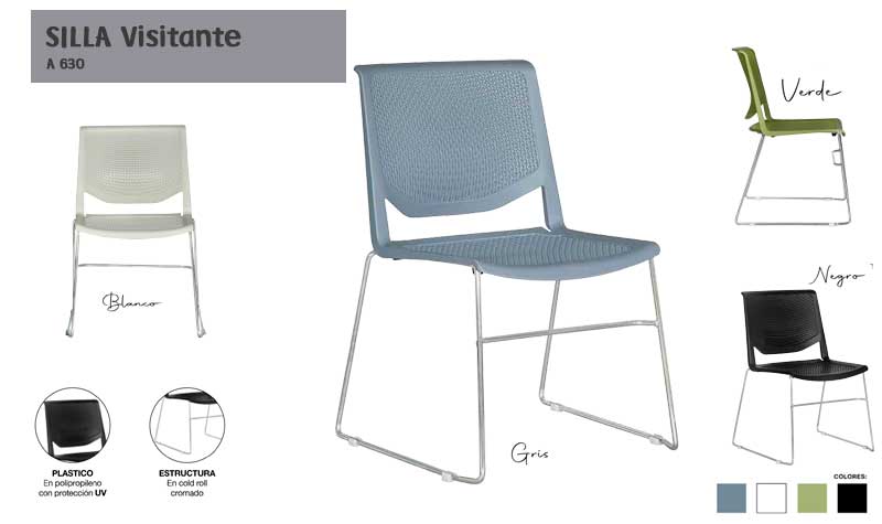 Respaldo y asiento en polipropileno, en colores blanco, gris, negro y verde, con protección UV, estructura en cold roll de 1/2”, terminado en cromo, regaton antiderrapante en polipropileno, para evitar rayaduras en piso.