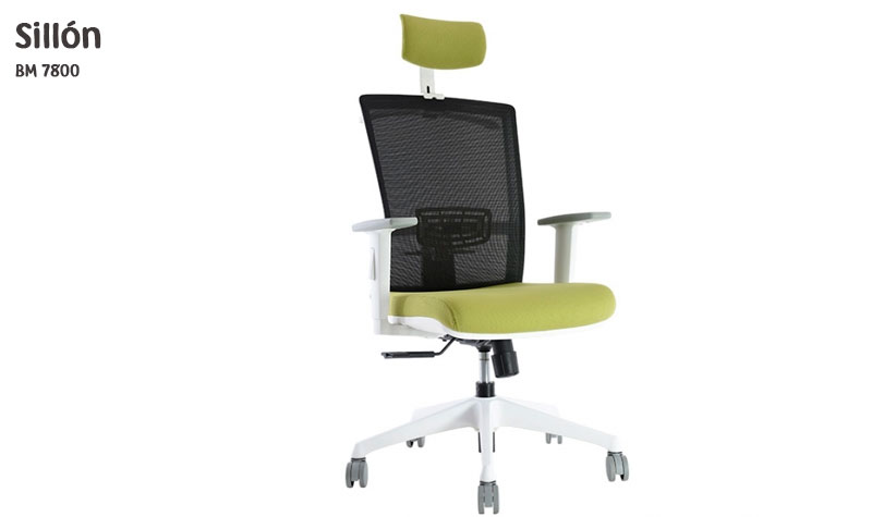 Sillón para dirección en color blanco con cabecera, respaldo de malla color negro y asiento tapizado, soporte lumbar ajustable, brazos con ajuste de altura, poliuretano en asiento y mecanismo syncro autorregulable.