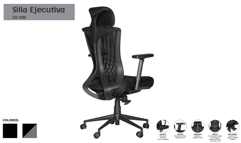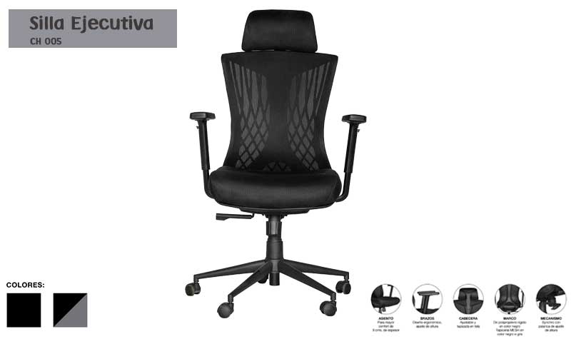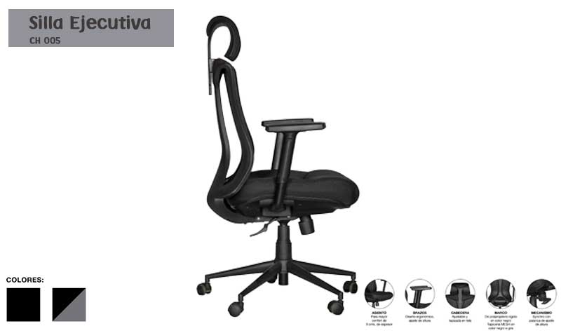 Respaldo con estructura en polipropileno en color negro, tapizado en malla color negro o gris, asiento de triplay, hule espuma de 9 cms. de espesor con densidad 30g/m3., tapa plastica en color negro, tapizado en tela color negro o gris, cabecera con ajuste de altura de 5 cms. extendible y hule espuma con densidad de 24g/cm3 tapizada en tela microespacial color negro o gris, mecanismo syncro, sistema de ajuste reclinable, con 3 posiciones y sistema antishock, piston ejecutivo, con 50,000 ciclos de uso continuo, base metalica en color negro de 26” de 5 puntas, brazos ergonomico en polipropileno y con ajuste de altura.